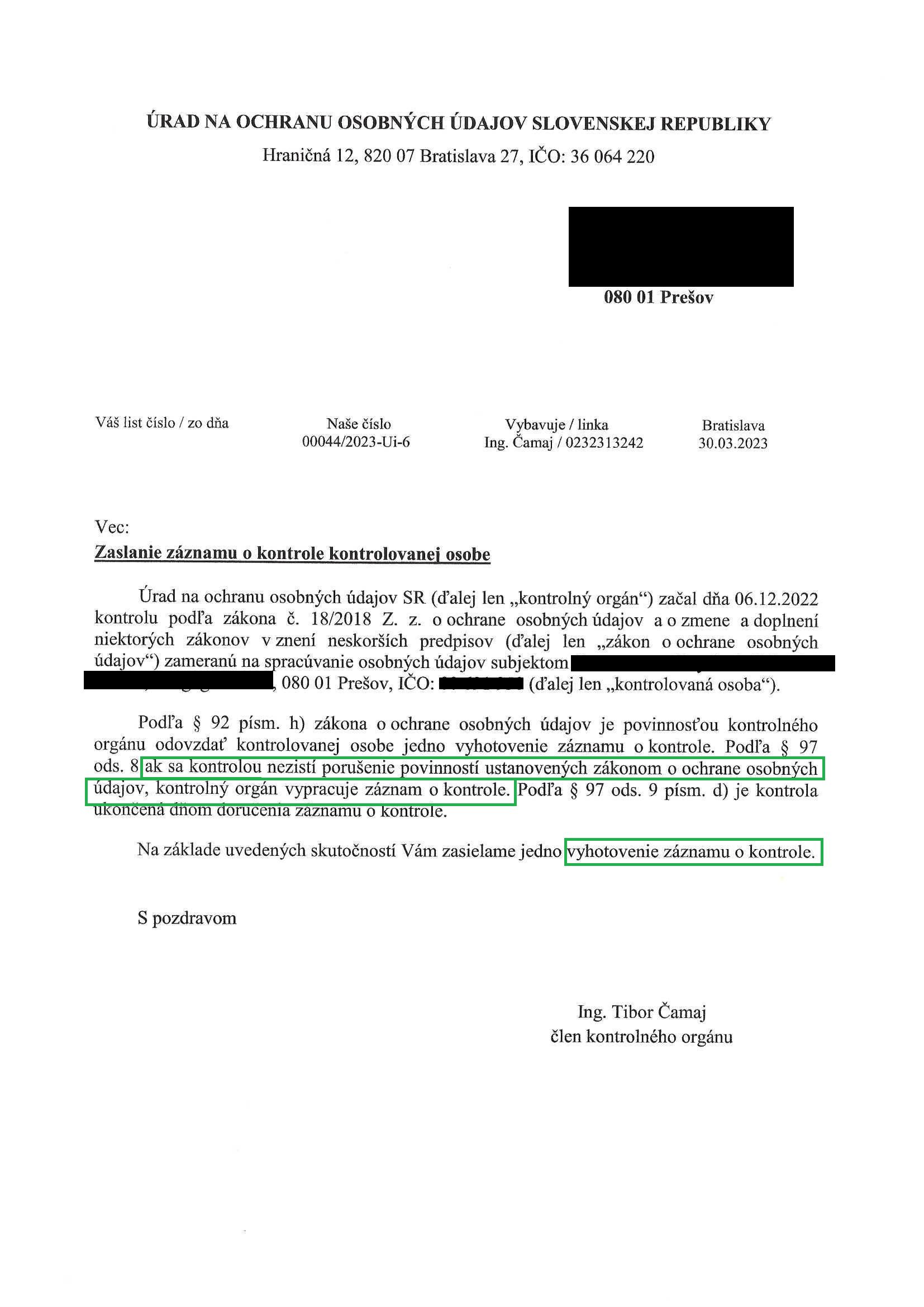 Týmto by sme chceli poďakovať kontrolovanej spoločnosti za súhlas so zverejnením záverečnej správy z kontroly.